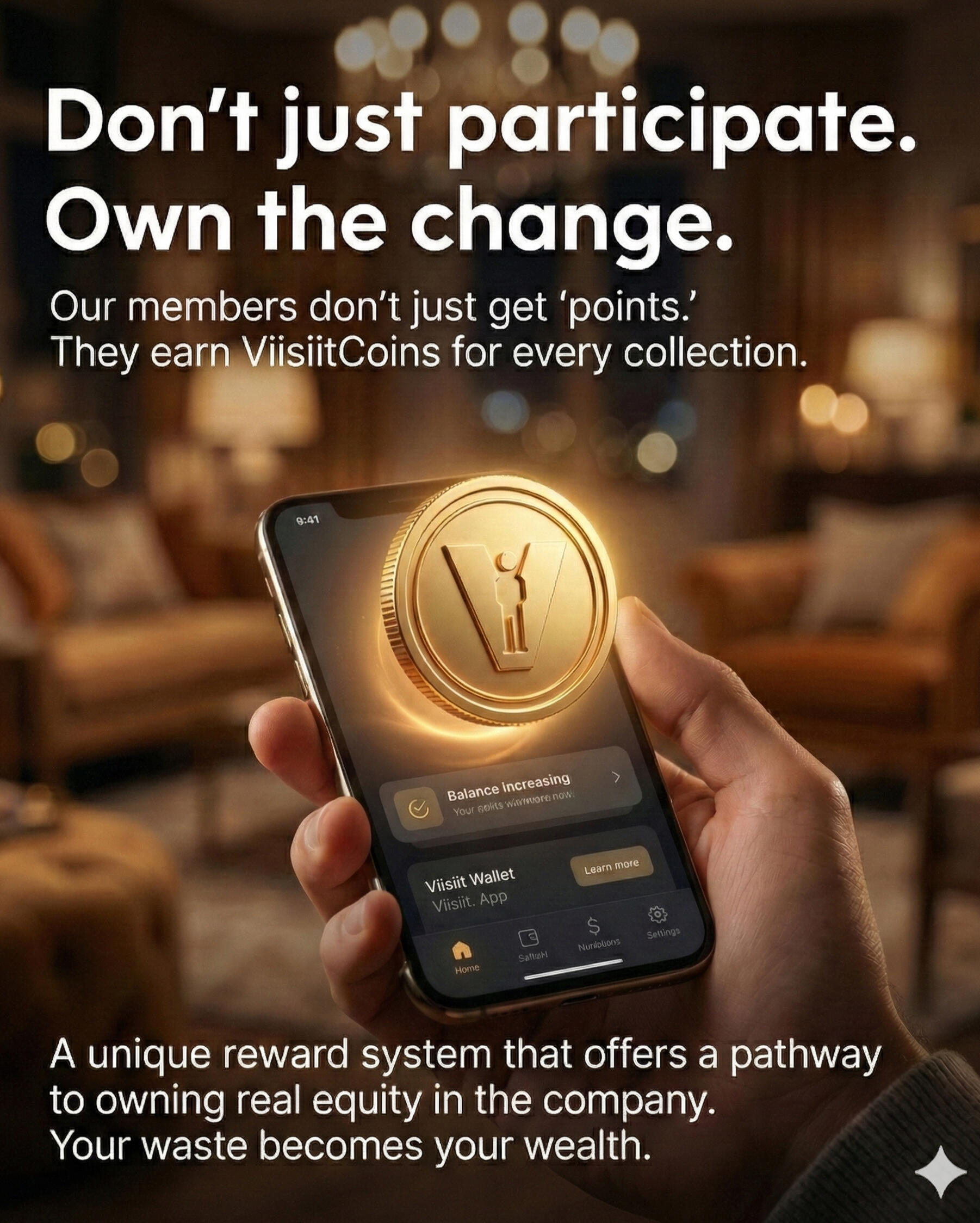 Viisiit.® is building a future where sustainable actions is financially rewarding to us end-users, the ones who consume the products & services, too.Earn ViisiitCoins (VCs) be engaging with our platform and reusable & recyclable material collection service.Mandated by our statutes, these VCs will be linked to security tokens that our members can exchange for common share-certificates, ensuring a future where impact means profits shared directly with our members too.