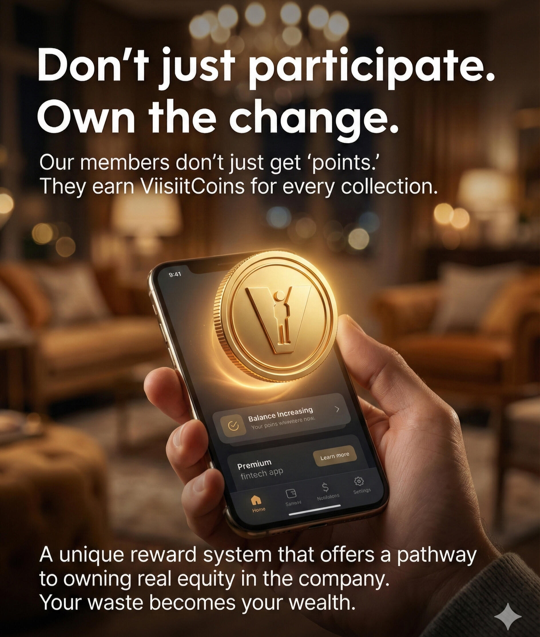 Viisiit.® is building a future where sustainable actions is financially rewarding to us end-users, the ones who consume the products & services, too.Earn ViisiitCoins (VCs) be engaging with our platform and reusable & recyclable material collection service.Mandated by our statutes, these VCs will be linked to security tokens that our members can exchange for common share-certificates, ensuring a future where impact means profits shared directly with our members too.